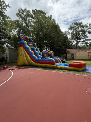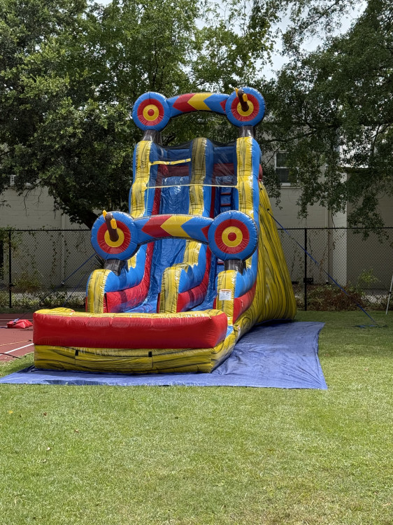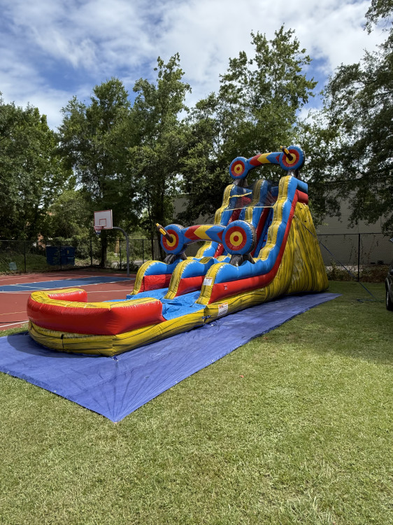 The Target 19 Ft Slide features a fun yellow and red archery-themed design, making it a great choice for parties and events. It includes safety netting for secure sliding, sealed seams to reduce water leaks, and a deep pool at the bottom. Dimensions are 36 feet long, 11 feet wide, and 19 feet high.
